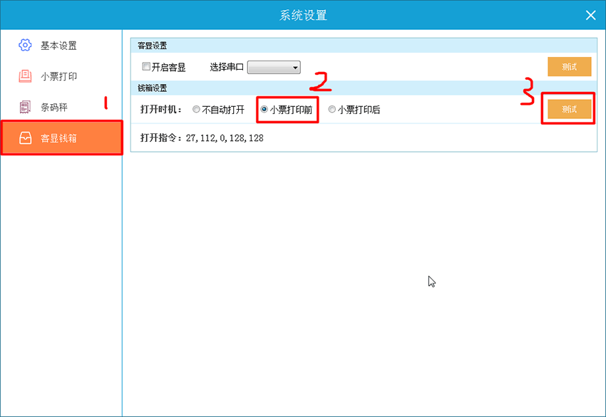 2、进入“客显钱箱”设置项,根据需要选择“打开时机”,然后点击“测试”按钮检查钱箱是否打开。“打开指令”通常无需设置。