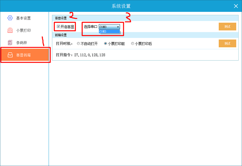 2、进入“客显钱箱”设置项,勾选“开启客显”,选择客显端口,最后点击“测试”观察客显是否显示。