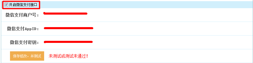 勾选“开启微信支付接口”,填入接口信息,点击“保存修改,并测试”,接口信息可进入微信公众号后台获取。