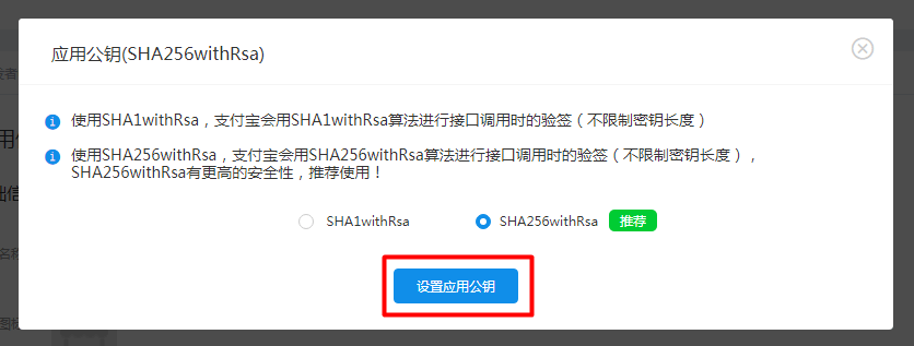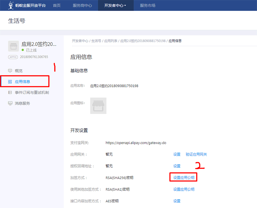支付宝当面付签约成功后需要配置应用公钥,点此进入支付宝开放平台1、进入“应用信息”页面,点击“加签方式”项目的“设置应用公钥”