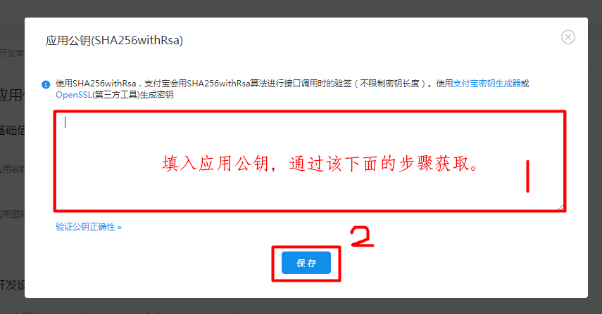 4、验证完成,打开应用公钥填写页面,从下面的步骤获取应用公钥。