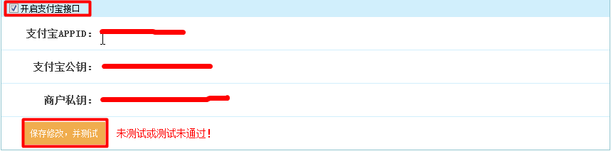 4、登录收银后台进入系统设置->支付方式,找到支付宝接口,填入接口信息,点击“保存修改,并测试”