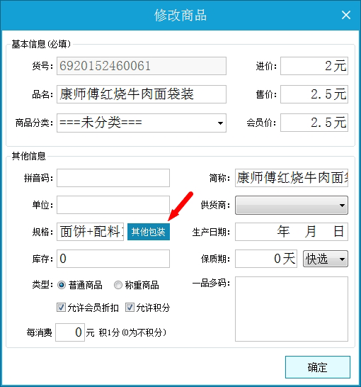 2、录入大包装信息,包装数量输入大包装包含的小包装数,如1箱方便面有24包包装数量输入24。