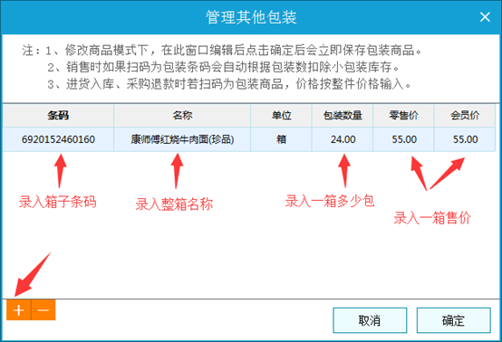 注:1、修改商品模式下,在此窗口编辑后点击确定后会立即保存包装商品。