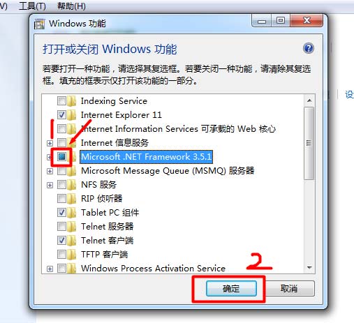 5、点击“Microsoft .NET Framework 3.5.1”签名的方框,使其处于如图所示的选中状态(实心方框),然后点击“确定”。