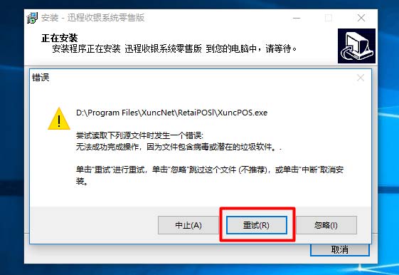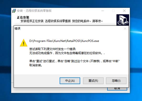 若Windows Defender错误拦截,会在安装收银系统是出现如下提示。