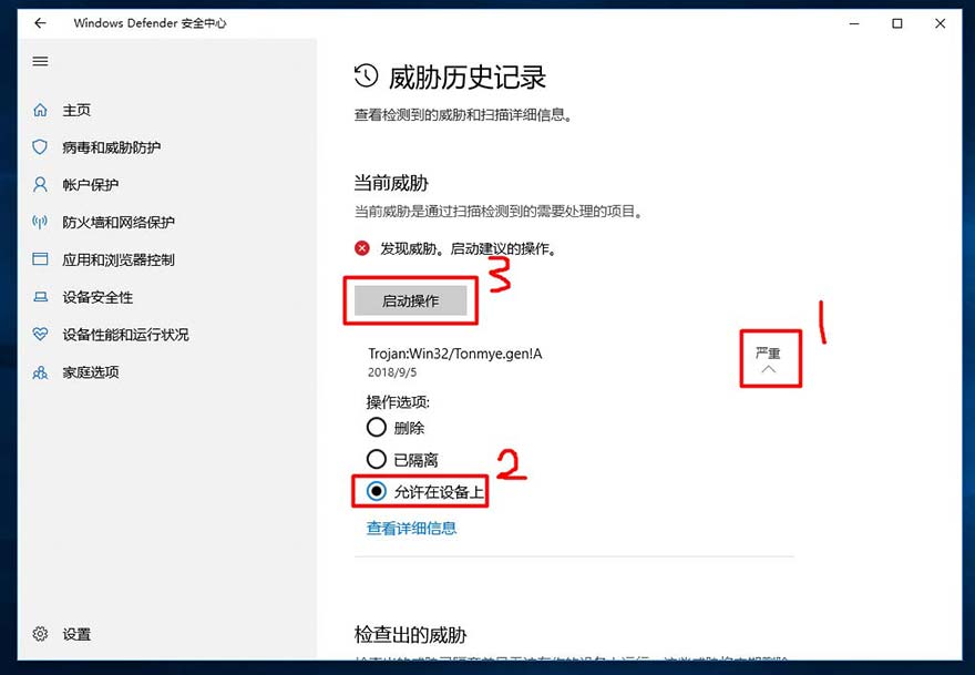 2、根据图片所示依次点击“严重”展开选项,然后选中“允许在设备上”,最后点击“启动操作”